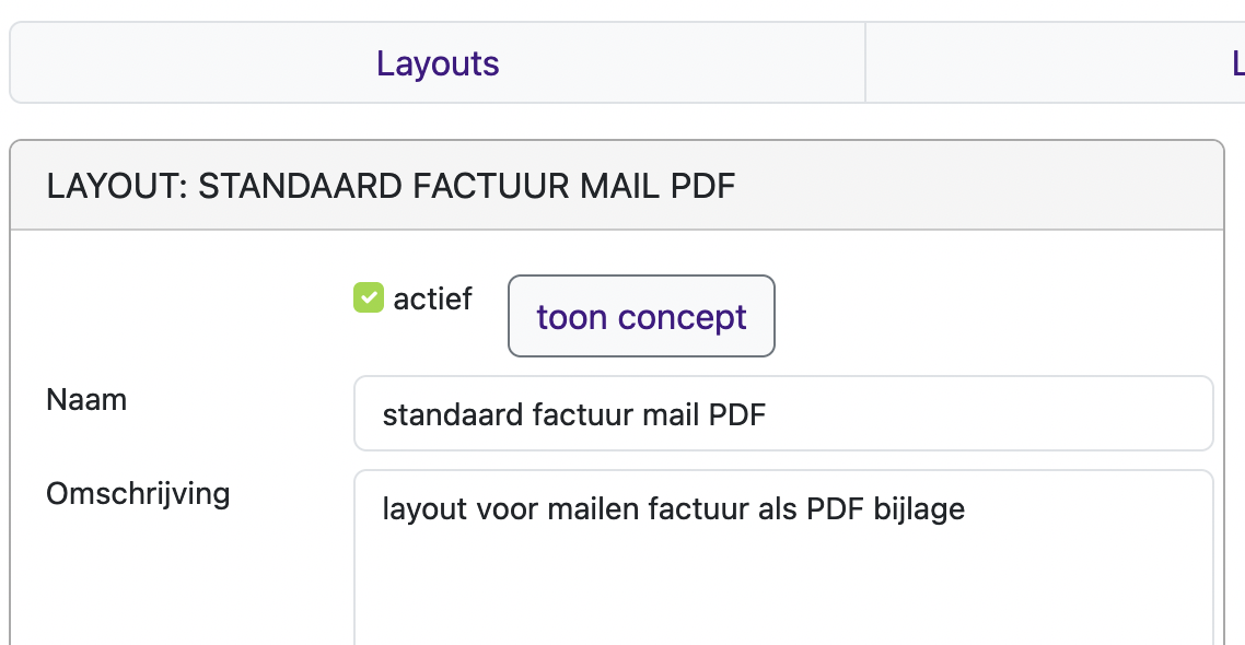 Kies daar de betreffende lay-out, u ziet daar diverse teksten die u kunt aanpassen. Uw IBAN nummer en BTW nummer staan doorgaans onder ’tekst 3′. Pas de tekst aan, bewaar, en dan kunt u via de knop ’toon concept’ bovenaan controleren of uw wijziging goed op de factuur komt. Bij alle NIEUWE facturen die u maakt, wordt deze wijziging meegenomen.