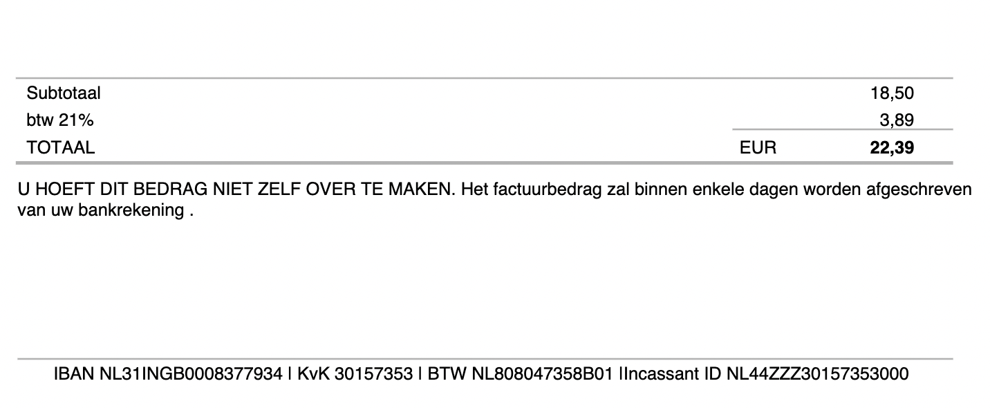 De factuur wordt gegenereerd in PDF en UBL formaat (voor zakelijke klanten, particulieren krijgen alleen een PDF factuur) en is daardoor niet direct te wijzigen.